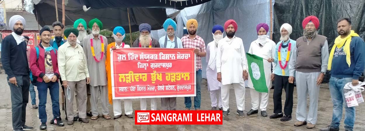 ਗੁਰਦਾਸਪੁਰ, 22 ਅਪ੍ਰੈਲ (ਸੰਗਰਾਮੀ ਲਹਿਰ ਬਿਊਰੋ)- ਸਥਾਨਕ ਰੇਲਵੇ ਸਟੇਸ਼ਨ ‘ਚ ਚਲਦੇ ਮੋਰਚੇ ਦੇ 203ਵੇਂ ਅੱਜ 121ਵੇਂ ਜਥੇ ਨੇ ਭੁੱਖ ਹੜਤਾਲ ਰੱਖੀ। ਅੱਜ ਇਸ ‘ਚ ਮਹਿੰਦਰ ਸਿੰਘ ਲਖਣ ਖੁਰਦ, ਲੱਖਾ ਸਿੰਗ ਬਖਤਪੁਰ, ਸੁੱਚਾ ਸਿੰਘ ਬਖਤਪੁਰ ਤੇ ਅਜੀਤ ਸਿੰਘ ਨੇ ਹਿਸਾ ਲਿਆ। ਇਸ ਦੌਰਾਨ ਅੱਜ ਸੰਯੁਕਤ ਕਿਸਾਨ ਮੋਰਚੇ ਦੇ ਅਗਵਾਈ ਹੇਠ ਇੱਕ ਵਫ਼ਦ ਡਿਪਟੀ ਕਮਿਸ਼ਨਰ ਗੁਰਦਾਸਪੁਰ ਨੂੰ ਮਿਲਿਆ, ਜਿਥੇ ਕਮਕ ਦੀ ਖਰੀਦ ਲਈ ਬਾਰਦਾਨੇ ਦੀ ਕਮੀ ਅਤੇ ਲਿਫਟਿੰਗ ‘ਚ ਆ ਰਹੀ ਮੁਸ਼ਕਲ ਬਾਰੇ ਚਰਚਾ ਕੀਤੀ ਗਈ। ਆਗੂਆਂ ਨੇ ਰਾਤ ਵੇਲੇ ਲੱਗਣ ਵਾਲੇ ਕਰਫਿਊ ਕਾਰਨ ਦਰਪੇਸ਼ ਮੁਸ਼ਕਲਾਂ ਬਾਰੇ ਵੀ ਮੁੱਦਾ ਸਾਹਮਣੇ ਰੱਖਿਆ। ਮਗਰੋਂ ਆਗੂਆਂ ਨੇ ਦਾਅਵਾ ਕੀਤਾ ਕਿ ਡਿਪਟੀ ਕਮਿਸ਼ਨਰ ਨੇ ਸਾਰੇ ਮਸਲਿਆਂ ਦਾ ਹੱਲ ਕਰਨ ਦਾ ਯਕੀਨ ਦਵਾਇਆ।