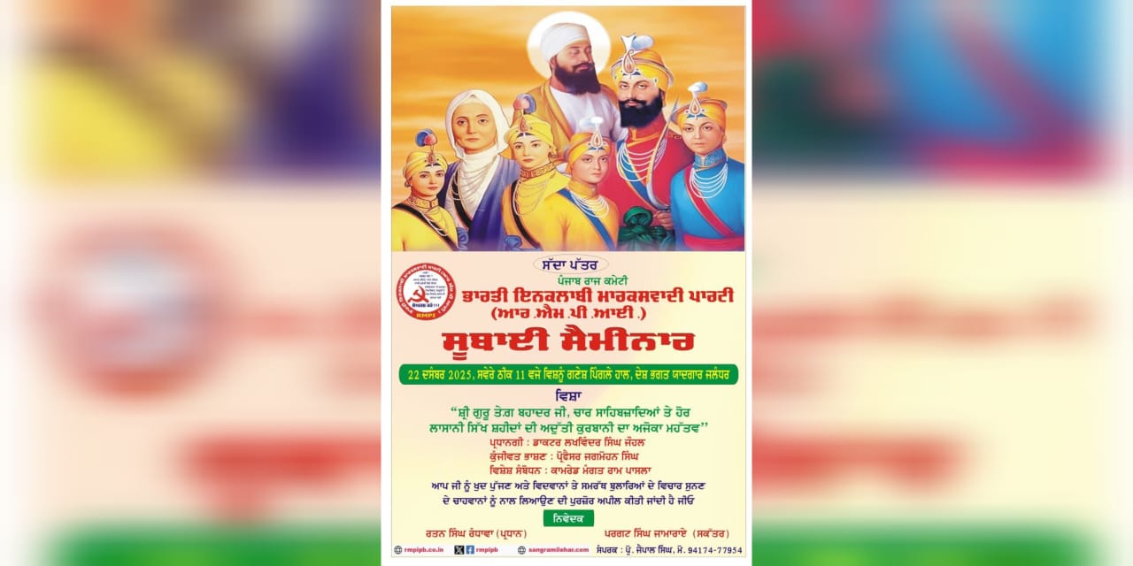 ਆਰ ਐੱਮ ਪੀ ਆਈ ਵਲੋਂ 22 ਦਸੰਬਰ ਨੂੰ ਹੋਵੇਗਾ ਲਾਸਾਨੀ ਸਿੱਖ ਸ਼ਹੀਦਾਂ ਦੀ ਯਾਦ ‘ਚ ਜਲੰਧਰ ਵਿਖੇ ਸੂਬਾਈ ਸੈਮੀਨਾਰ