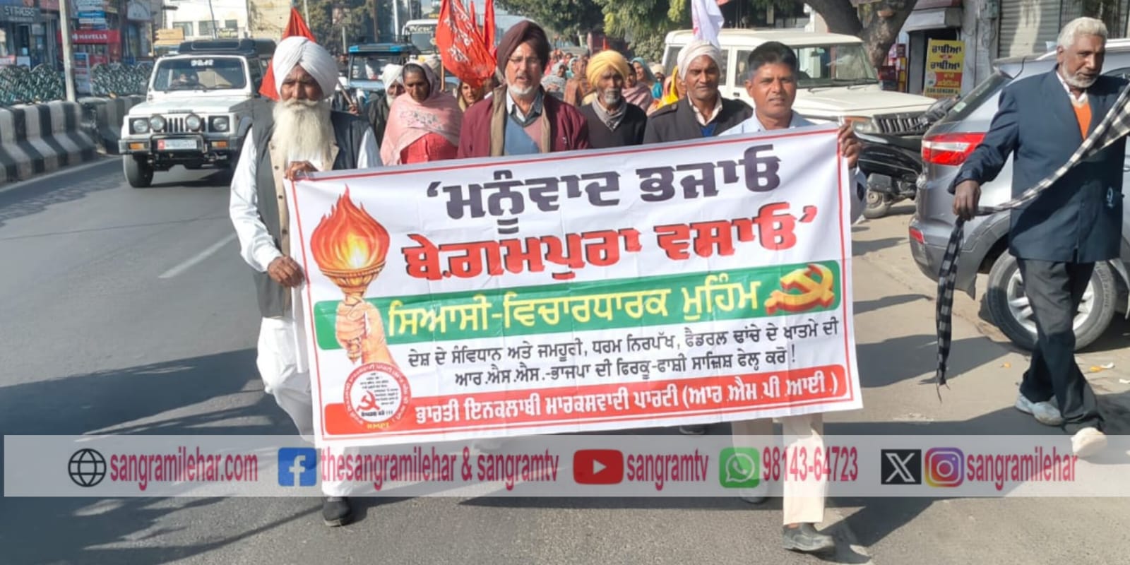 ਬਠਿੰਡਾ: ਭਾਰਤੀ ਇਨਕਲਾਬੀ ਮਾਰਕਸਵਾਦੀ ਪਾਰਟੀ ( ਆਰ.ਐਮ.ਪੀ.ਆਈ.) ਵਲੋਂ ਸੂਬੇ ਭਰ ‘ਚ ਜਾਰੀ ‘ਮਨੂੰਵਾਦ ਭਜਾਓ ਬੇਗ਼ਮਪੁਰਾ ਵਸਾਓ’ ਮੁਹਿੰਮ ਦੀ ਕੜੀ ਵਜੋਂ ਅੱਜ ਪਾਰਟੀ ਦੀ ਬਠਿੰਡਾ-ਮਾਨਸਾ ਜਿਲ੍ਹਾ ਕਮੇਟੀ ਦੇ ਸੱਦੇ ‘ਤੇ ਪੁਜੇ ਕਿਰਤੀ-ਕਿਸਾਨਾਂ ਅਤੇ ਔਰਤਾਂ ਨੇ ਬਠਿੰਡਾ ਸ਼ਹਿਰ ਵਿਖੇ ਰੋਹ ਭਰਪੂਰ ਮੁਜ਼ਾਹਰਾ ਕੀਤਾ।