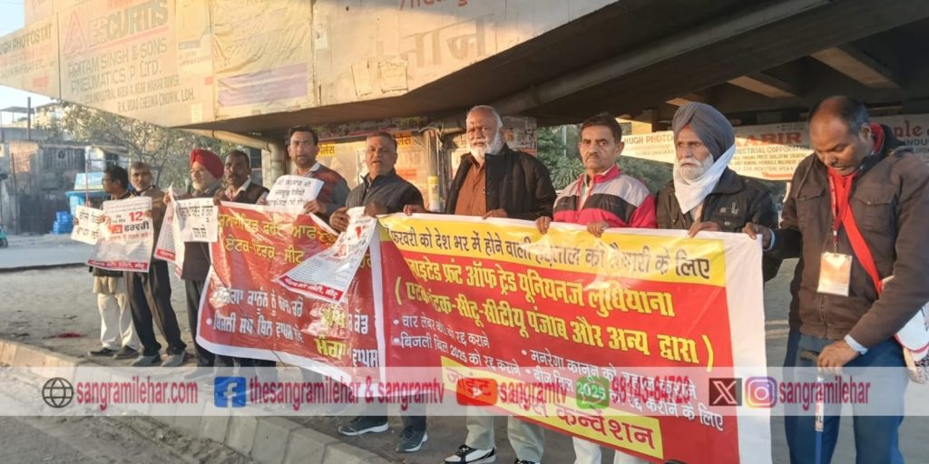 ਲੁਧਿਆਣਾ: ਯੂਨਾਈਟਡ ਫ਼ਰੰਟ ਆਫ਼ ਟ੍ਰੇਡ ਯੂਨੀਅਨਜ ਲੁਧਿਆਣਾ, ਜਿਸ ਵਿੱਚ ਏਟਕ, ਇੰਟਕ, ਸੀਟੂ, ਐਕਟੂ ਅਤੇ ਸੀਟੀਯੂ ਪੰਜਾਬ ਸ਼ਾਮਿਲ ਹਨ, ਦੇ ਆਗੂਆਂ ਨੇ ਅੱਜ ਇੱਥੇ ਚੀਮਾ ਚੌਂਕ ਵਿਖੇ ਜਾਗਰੂਕਤਾ ਰੈਲੀ ਕੀਤੀ ਅਤੇ 12 ਫਰਵਰੀ ਦੀ ਦੇਸ਼ ਵਿਆਪੀ ਆਮ ਹੜਤਾਲ ਦੇ ਸਬੰਧ ਵਿੱਚ ਲੋਕਾਂ ਨੂੰ ਸੂਚਿਤ ਕੀਤਾ। ਆਮ ਹੜਤਾਲ ਦੀ ਤਿਆਰੀ ਨੂੰ ਲੈ ਕੇ ਆਗੂਆਂ ਨੇ ਵੱਖ ਵੱਖ ਮੁੱਦਿਆਂ ਤੇ ਜਿਨ੍ਹਾਂ ਵਿੱਚ ਚਾਰ ਲੇਬਰ ਕੋਡ ਰੱਦ ਕਰਕੇ ਪੁਰਾਣੇ ਕਿਰਤ ਕਾਨੂੰਨ ਬਹਾਲ ਕਰਨ, ਮਨਰੇਗਾ ਕਾਨੂੰਨ ਨੂੰ ਬਹਾਲ ਕਰਨ, ਬਿਜਲੀ ਸੋਧ ਬਿੱਲ 2025 ਨੂੰ ਰੱਦ ਕਰਨ ਅਤੇ ਬੀਜ ਬਿਲ 2025 ਦੇ ਮਾਰੂ ਪ੍ਰਭਾਵਾਂ ਬਾਰੇ ਆਪਣੇ ਵਿਚਾਰ ਸਾਂਝੇ ਕੀਤੇ। ਹਾਜ਼ਰ ਆਗੂਆਂ ਵਿੱਚ ਗੁਰਜੀਤ ਸਿੰਘ ਜਗਪਾਲ, ਸੁਖਮਿੰਦਰ ਸਿੰਘ ਲੋਟੇ, ਜੈ ਪ੍ਰਕਾਸ਼ ਨਰਾਇਣ, ਕੇਵਲ ਸਿੰਘ ਬਨਵੈਤ, ਰਾਮ ਲਾਲ, ਜਗਦੀਸ਼ ਚੰਦ, ਅਜੀਤ ਕੁਮਾਰ, ਬਲਰਾਮ ਅਤੇ ਹੋਰ ਆਗੂ ਸ਼ਾਮਿਲ ਸਨ।