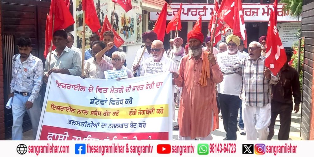 ਸਥਾਨਕ ਦੇਸ਼ ਭਗਤ ਯਾਦਗਾਰ ਹਾਲ ਵਿਖੇ ਜ਼ਿਲ੍ਹਾ ਪੱਧਰੀ ਇਕੱਠ ਕਰਕੇ ਬੀਐੱਮਸੀ ਚੌਂਕ ਤੱਕ ਮੁਜ਼ਾਹਰਾ ਕਰਕੇ ਇਜ਼ਰਾਇਲੀ ਵਿੱਤ ਮੰਤਰੀ ਦੇ ਭਾਰਤ ਦੌਰੇ ਦਾ ਤਿੱਖਾ ਵਿਰੋਧ ਕੀਤਾ ਅਤੇ ਉਸਨੂੰ ਤੁਰੰਤ ਭਾਰਤ ‘ਚੋਂ ਵਾਪਸ ਜਾਣ ਲਈ ਕਿਹਾ ਗਿਆ।