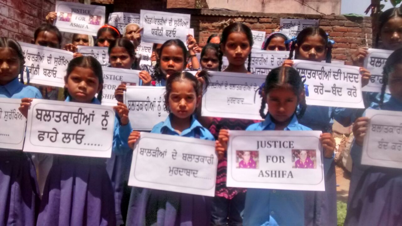 ਪਠਾਨਕੋਟ- ਭਾਰਤੀ ਇਨਕਲਾਬੀ ਮਾਰਕਸਵਾਦੀ ਪਾਰਟੀ ਵੱਲੋਂ ਅੱਜ ਕਠੂਆ ਕਾਂਡ ਖ਼ਿਲਾਫ਼ ਆਪਣੇ ਰੋਹ ਦਾ ਪ੍ਰਗਟਾਵਾ ਕੀਤਾ ਗਿਆ। ਇਸ ਮੌਕੇ ਖ਼ਾਸ ਕਰ ਬੱਚੀਆਂ ਨੇ ਸਲੋਗਨ ਦੀਆਂ ਤਖ਼ਤੀਆਂ ਫੜ ਕੇ ਮਾਰਚ ਕੀਤਾ। ਇਸ ਦੀ ਅਗਵਾਈ ਮਾਸਟਰ ਸੁਭਾਸ਼ ਸ਼ਰਮਾ, ਆਸ਼ਾ ਰਾਣੀ ਢਾਂਗੂ, ਸੁਮਨ, ਸ਼ਮਾ ਦੇਵੀ, ਆਰਤੀ, ਕੋਮਲ, ਜੋਤੀ, ਰਮਨ, ਰੇਖਾ, ਅਨੀਤਾ, ਸਿਮਰਨ, ਜਨਕ, ਰਾਣੀ ਦੇਵੀ, ਵਿਦਿਆ ਦੇਵੀ, ਨੀਲਮ, ਮਨਜੀਤ, ਗੁਰਪ੍ਰੀਤ, ਗੁਨੂੰ ਆਦਿ ਨੇ ਕੀਤੀ।