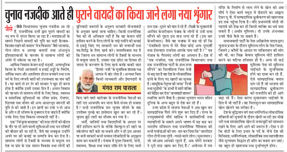जैसे -जैसे विधानसभा चुनाव नजदीक आ रहे हैं, राजनीतिक दलों द्वारा पुराने वायदों का नए रूप में शृंगार किया जा रहा है। मतदाताओं के सामने पिछले वायदों की पूर्ति का सही हिसाब-किताब रखने की बजाय ‘तेज विकास’ जैसे भटकाऊ, गोल-मोल व अस्पष्ट बयानों तथा अंधाधुंध इश्तिहारबाजी के माध्यम से सामान्य लोगों को अंधेरे में धकेला जा रहा है।