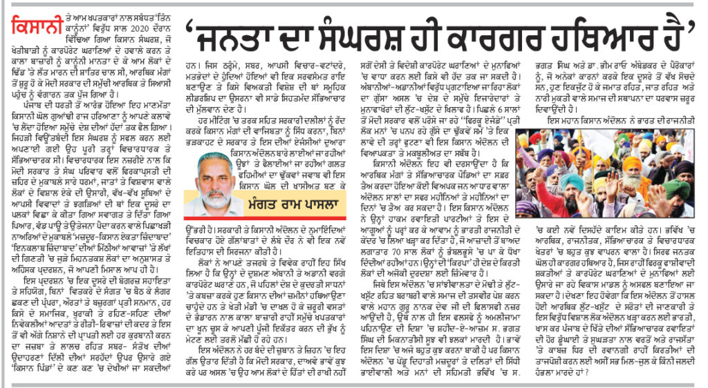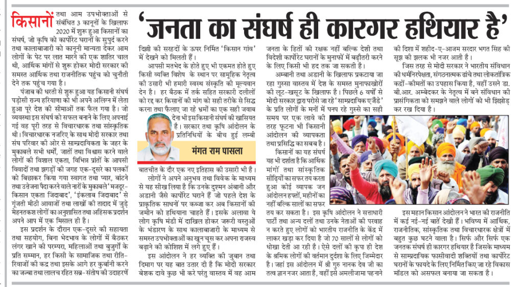 जिस तरह से मोदी सरकार ने भारतीय संविधान की धर्मनिरपेक्षता, संगठनात्मक ढांचे तथा लोकतांत्रिक कद्रों-कीमतों का उपहास किया है, वहीं उसने डा. बी.आर. अम्बेदकर के नेतृत्व में बने संविधान की प्रासंगिकता को समझने वाले लोगों को भी झिंझोड़ कर रख दिया है। इस महान किसान आंदोलन ने भारत की राजनीति में कई नई-नई बातें देखी हैं। भविष्य में आर्थिक, राजनीतिक, सांस्कृतिक तथा विचारधारक क्षेत्रों में बहुत कुछ घटने वाला है। सिर्फ और सिर्फ एक जनतक संघर्ष ही कारगर हथियार है जिसके माध्यम से साम्प्रदायिक फासीवादी शक्तियों तथा कार्पोरेट घरानों के फायदे के लिए निर्मित किए जा रहे विकास मॉडल को असफल बनाया जा सकता है।