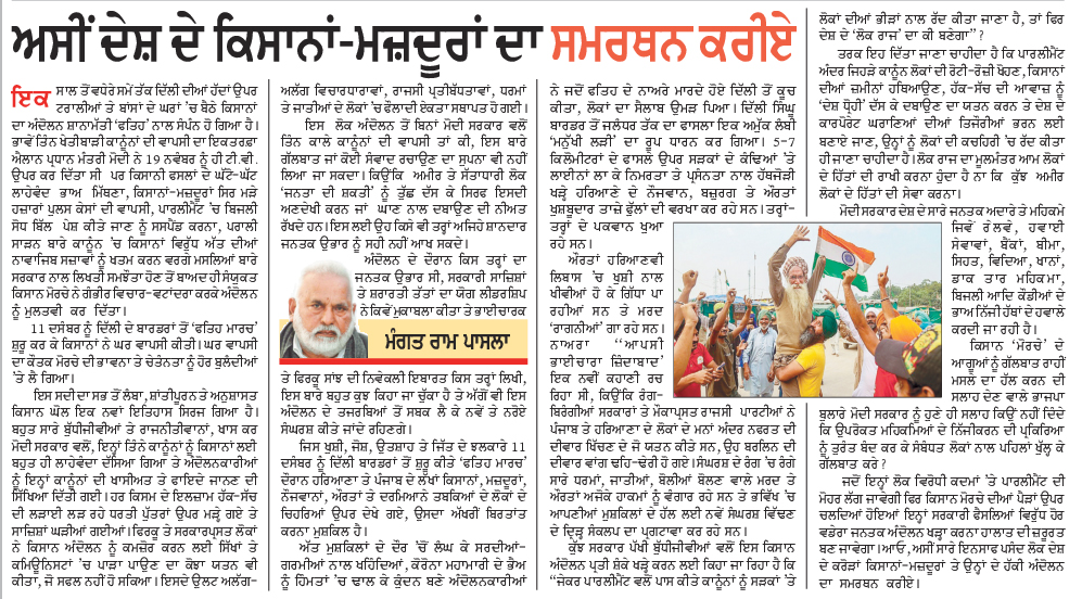ਆਓ ਸਾਰੇ ਇਨਸਾਫ ਪਸੰਦ ਲੋਕ ਦੇਸ਼ ਦੇ ਕਰੋੜਾਂ ਕਿਸਾਨਾਂ-ਮਜ਼ਦੂਰਾਂ ਤੇ ਉਨ੍ਹਾਂ ਦੇ ਹੱਕੀ ਅੰਦੋਲਨ ਦੀ ਹਮਾਇਤ ’ਤੇ ਨਿੱਤਰੀਆਂ ਧਾਰਮਿਕ ਤੇ ਸਮਾਜਿਕ ਜਥੇਬੰਦੀਆਂ, ਸਵੈ ਸੇਵੀ ਸੰਸਥਾਵਾਂ, ਅਸੂਲ ਪ੍ਰਸਤ ਮੀਡੀਆ, ਬੁੱਧੀਜੀਵੀਆਂ, ਕਲਮਕਾਰਾਂ, ਛੋਟੇ ਦੁਕਾਨਦਾਰਾਂ ਤੇ ਵਿਉਪਾਰੀਆਂ ਨੂੰ ਦਿਲ ਦੀਆਂ ਗਹਿਰਾਈਆਂ ਤੋਂ ਮੁਬਾਰਕਬਾਦ ਦਿੰਦੇ ਹੋਏ ਸ਼ਹੀਦ ਹੋਏ ਯੋਧਿਆਂ ਦੀਆਂ ਸ਼ਹਾਦਤਾਂ ਨੂੰ ਪ੍ਰਣਾਮ ਕਰੀਏ।