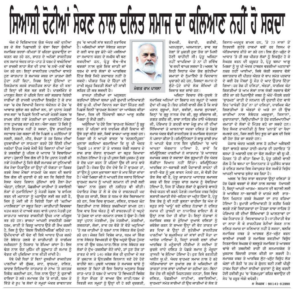 ਅਸਲ ’ਚ ਇਹ ਸਾਰਾ ਵਰਤਾਰਾ ਉਨ੍ਹਾਂ ਦਲਿਤਾਂ ਤੇ ਹੋਰ ਪੱਛੜੇ ਵਰਗਾਂ ਦੇ ਲੋਕਾਂ ਨਾਲ ਸਰਾਸਰ ਧੋਖਾਧੜੀ ਹੈ, ਜਿਨ੍ਹਾਂ ਨੇ ਆਪਣੇ ਆਤਮ ਸਨਮਾਨ ਦੀ ਬਹਾਲੀ ਲਈ ਤੇ ਆਰਥਿਕ ਨਾ ਬਰਾਬਰੀ ਦੇ ਖਾਤਮੇ ਲਈ ਰਾਤ-ਦਿਨ ਮਿਹਨਤ ਕਰਕੇ ਸੰਘਰਸ਼ਾਂ ਦਾ ਰਾਹ ਫੜ੍ਹਿਆ ਹੋਇਆ ਹੈ। ਕੁਮਾਰੀ ਮਾਇਆਵਤੀ ਜੀ ਤੇ ਸਤੀਸ਼ ਮਿਸ਼ਰੇ ਵਰਗੇ ਨਵੇਂ ਸਿਧਾਂਤਕਾਰਾਂ ਦਾ ਪੈਂਤੜਾ ਬਾਬਾ ਸਾਹਿਬ ਤੇ ਪੇਰਿਆਰ ਜੀ ਦੀਆਂ ਸਿੱਖਿਆਵਾਂ ਤੇ ਘਾਲਣਾਵਾਂ ਦਾ ਘੋਰ ਨਿਰਾਦਰ ਤੇ ਵਿਸ਼ਵਾਸ਼ਘਾਤ ਹੈ। ਜਾਤੀਪਾਤੀ ਵੰਡ ਦਾ ਲਾਹਾ ਲੈ ਕੇ ਰਾਜਨੀਤਕ ਰੋਟੀਆਂ ਸੇਕਣ ਨਾਲ ਦਲਿਤ ਸਮਾਜ ਦਾ ਕਲਿਆਣ ਨਹੀਂ ਹੋ ਸਕਦਾ, ਬਲਕਿ ਸਮਾਜਿਕ ਜਬਰ ਤੇ ਆਰਥਿਕ ਲੁੱਟ ਖਸੁੱਟ ਕਰਨ ਵਾਲੀਆਂ ਰਾਜਸੀ ਤੇ ਸਮਾਜਿਕ ਸ਼ਕਤੀਆਂ ਵਿਰੁੱਧ ਨਿਰਣਾਇਕ ਸੰਘਰਸ਼ ਦੇ ਬਲਬੂਤੇ ਸਮਾਜਿਕ ਤੇ ਆਰਥਿਕ ਢਾਂਚੇ ਦੀ ਤਬਦੀਲੀ ਰਾਹੀਂ ਹੀ ਸਨਮਾਨ ਯੋਗ ਤੇ ਖੁਸ਼ਹਾਲ ਜ਼ਿੰਦਗੀ ਹਾਸਲ ਕੀਤੀ ਜਾ ਸਕਦੀ ਹੈ। ਸਮਾਜਕ ਜਬਰ ਤੇ ਆਰਥਿਕ ਲੁੱਟ-ਖਸੁੱਟ ਵਿਰੁੱਧ ਲੋਕ ਘੋਲਾਂ ਦੀ ਭੱਠੀ ’ਚ ਤਪਕੇ ਕੁੰਦਨ ਬਣੀ ਨਵੀਂ ਪੀੜ੍ਹੀ ਹਾਕਮ ਧਿਰਾਂ ਦੀਆਂ ਸਾਰੀਆਂ ਕੁਚਾਲਾਂ ਨੂੰ ਫੇਲ੍ਹ ਕਰਦੀ ਹੋਈ ਹਕੀਕੀ ਰੂਪ ’ਚ ‘ਬੇਗ਼ਮਪੁਰਾ’ ਸ਼ਹਿਰ ਵਸਾਉਣ ਦੀ ਸੇਧ ’ਚ ਜ਼ਰੂਰ ਅੱਗੇ ਵਧੇਗੀ। ਧੰਨਵਾਦ ਸਹਿਤ ਨਵਾਂ ਜ਼ਮਾਨਾ, 12 ਅਗਸਤ 2021