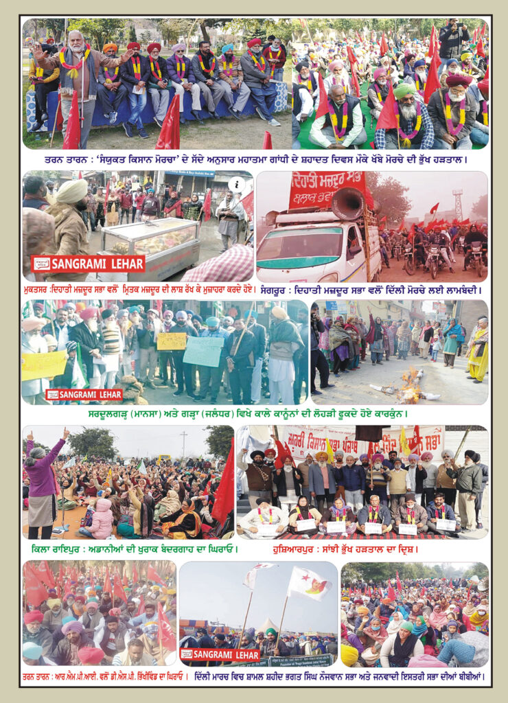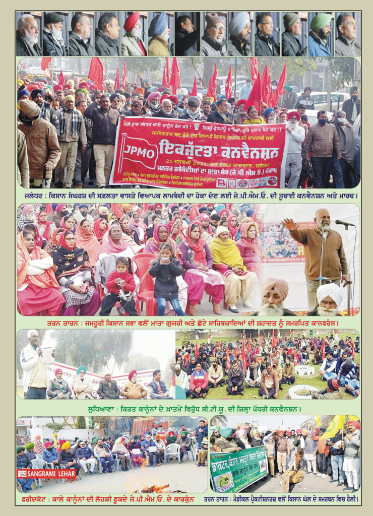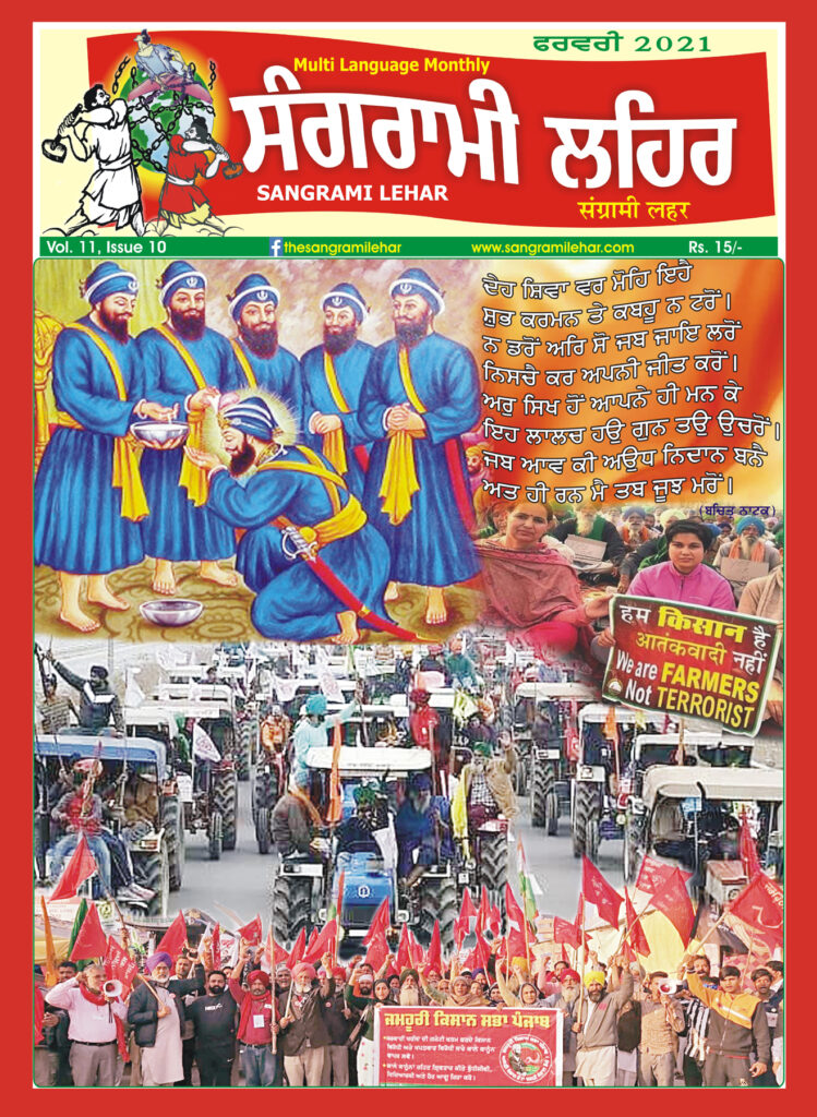 ਕਿਸਾਨ ਅੰਦੋਲਨ ਨੇ ਸਰਕਾਰ ਦਾ ਲੋਕ ਦੋਖੀ ਅਤੇ ਵਿਭਾਜਨਕਾਰੀ ਚਿਹਰਾ ਲੋਕਾਂ ਸਾਹਵੇਂ ਬੇਪਰਦ ਕਰ ਦਿੱਤਾ ਹੈ। ਅਸੀਂ ਇਹ ਕਹਿਣਾ ਚਾਹੁੰਦੇ ਹਾਂ ਕਿ ਇਸ ਅੰਦੋਲਨ ਦੇ ਨਤੀਜਿਆਂ ਨਾਲ ਭਾਰਤ ਦਾ ਭਵਿੱਖ ਬੱਝਾ ਹੋਇਆ ਹੈ। ਇਸ ਸੰਘਰਸ਼ ਦੀ ਜਿੱਤ ਦਾ ਨਤੀਜਾ ਲੋਕਾਂ ਦੀਆਂ ਜਿੱਤਾਂ ਤੇ ਲੋਕੀ ਦੋਖੀ ਸਰਕਾਰਾਂ ਦੇ ਪਤਨ ਦੇ ਰਾਹ ਪੱਧਰੇ ਕਰਨ ਦੇ ਰੂਪ ਵਿੱਚ ਨਿਕਲੇਗਾ। ਅਤੇ ਜੇ ਇਸ ਦੇ ਉਲਟ ਵਾਪਰਦਾ ਹੈ ਤਾਂ ਲੋਕਾਂ ਲਈ ਤਸ਼ੱਦਦ, ਲੁੱਟ-ਚੋਂਘ, ਅਫ਼ਰਾ-ਤਫ਼ਰੀ ਅਤੇ ਗੁਲਾਮੀ ਆਦਿ ਨਰਕਾਂ ਦੇ ਦਵਾਰ ਖੁੱਲੵ ਜਾਣਗੇ। ਲੋੜਾਂ ਦੀ ਲੋੜ ਇਹ ਹੈ ਕਿ ਦੇਸ਼ ਭਰ ਦੀ ਲੋਕਾਈ ਇਸ ਸੰਗਰਾਮ ਨੂੰ ਆਪਣਾ ਸੰਗਰਾਮ ਬਣਾਵੇ ਅਤੇ ਦੇਸ਼ ਦੀ ਜਮਹੂਰੀ ਲਹਿਰ ਨੂੰ ਇਸ ਦਿਸ਼ਾ ਵਿੱਚ ਠੋਸ ਪਹਿਲਕਦਮੀਆਂ ਕਰਨੀਆਂ ਚਾਹੀਦੀਆਂ ਹਨ।